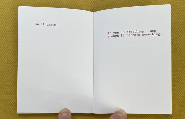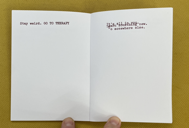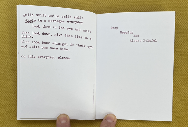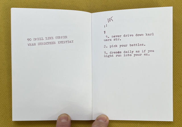 The title ADVICE FROM EVERYONE ABOUT EVERYTHING is the description of this publication. Over the past year we have been collecting advice about everything from everyone who has visited our table at art book and zine fairs and they have used various typewriters to type out their thoughts.
