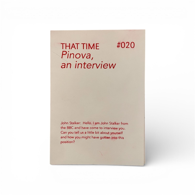 THAT TIME #020 - pinova is the twentieth zine in this ongoing series of the one page riso printed zines. This issue recounts a conversation between a "BBC" reporter and the fallen apple "pinova", which was part of a video work by April Gertler.